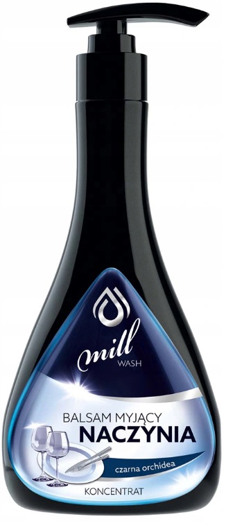 Środek myjący naczynia Mill Wash to skoncentrowany balsam do ręcznego mycia naczyń o delikatnym zapachu czarnej orchidei. Doskonale usuwa tłuszcz, osad i inne zabrudzenia. Dzięki zawartości ekstraktu z aloesu, gliceryny i kwasu mlekowego, które działają nawilżająco i kojąco, balsam jest łagodny dla skóry dłoni.