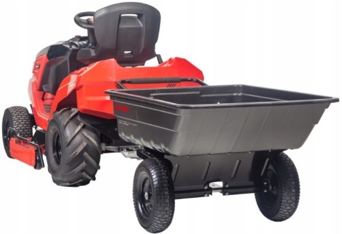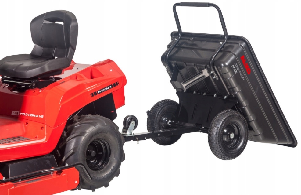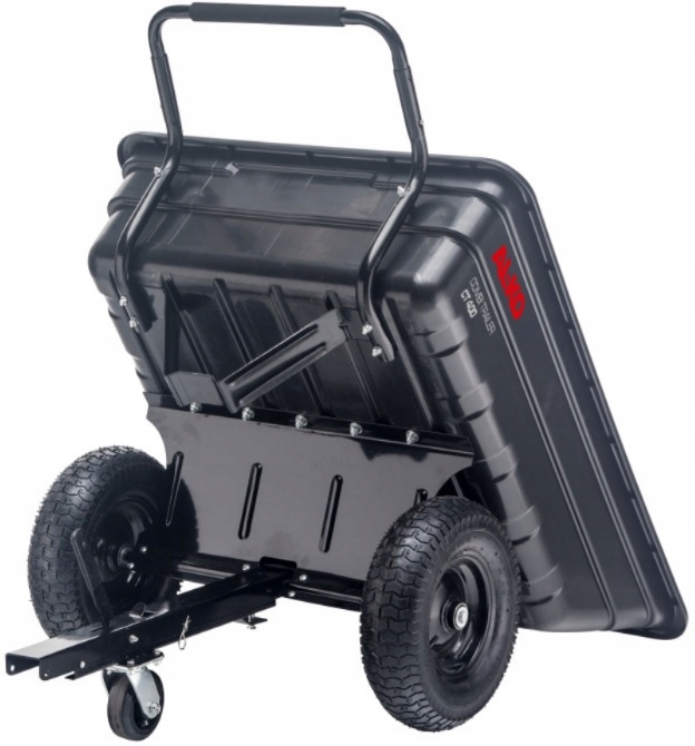 Przyczepka do traktorka ogrodowego CT 400. Wykonana ze stali oraz polipropylenu. Posiada składany dyszel, który pozwala na użycie przyczepki jak taczki oraz dodatkowe kółko na dyszlu ułatwiające pracę.