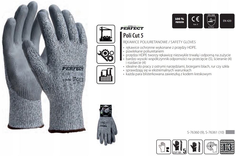 - Wykonane są z przędzy HDPE, dzięki której rękawica jest trwała oraz odporna na zużycie