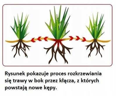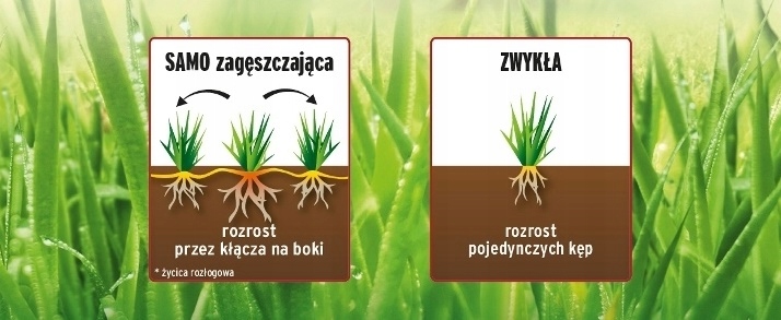 Tworzy zwartą, naturalną sieć samodzielnie rozrastających się na boki kłączy z których wyrastają nowe kępy trawy. W dalszym etapie każda nowo powstała kępa dalej wypuszcza w bok kłącza i następuje wzrost kolejnych kęp. W ten sposób następuje proces samo zagęszczania. Dzięki temu trawa szybko zadarnia wolne powierzchnie i ubytki, a w rezultacie intensywnego i bujnego wzrostu otrzymujemy gęsty trawnik na lata, zarówno w przypadku zakładania trawnika jak i renowacji trawnika.